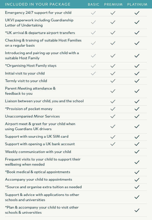 There is an initial non-refundable registration fee of £275 and the guardianship fee is payable in advance. Your child must also have a Student Expense Account to enable Guardians UK to pay for any optional services and for emergencies eg. airport transfers, Host Family stays and pocket money. We require at least £1200 at the start and regular top-ups when the balance falls below £500. Any money remaining in this account at the end of your child’s stay with Guardians UK will be refunded to you, having deducted any outstanding fees or expenses.